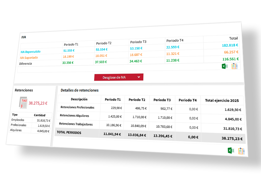 Extensión del módulo de “Dirección general” que profundiza en la situación de tu negocio. Te permite ver los Estados Contables y controlar cuáles son tus obligaciones fiscales, con cálculos sobre los pagos a realizar. También ofrece un control exhaustivo de las declaraciones fiscales y permite enviarlas a los clientes con un “clic”, ahorrando horas de trabajo.