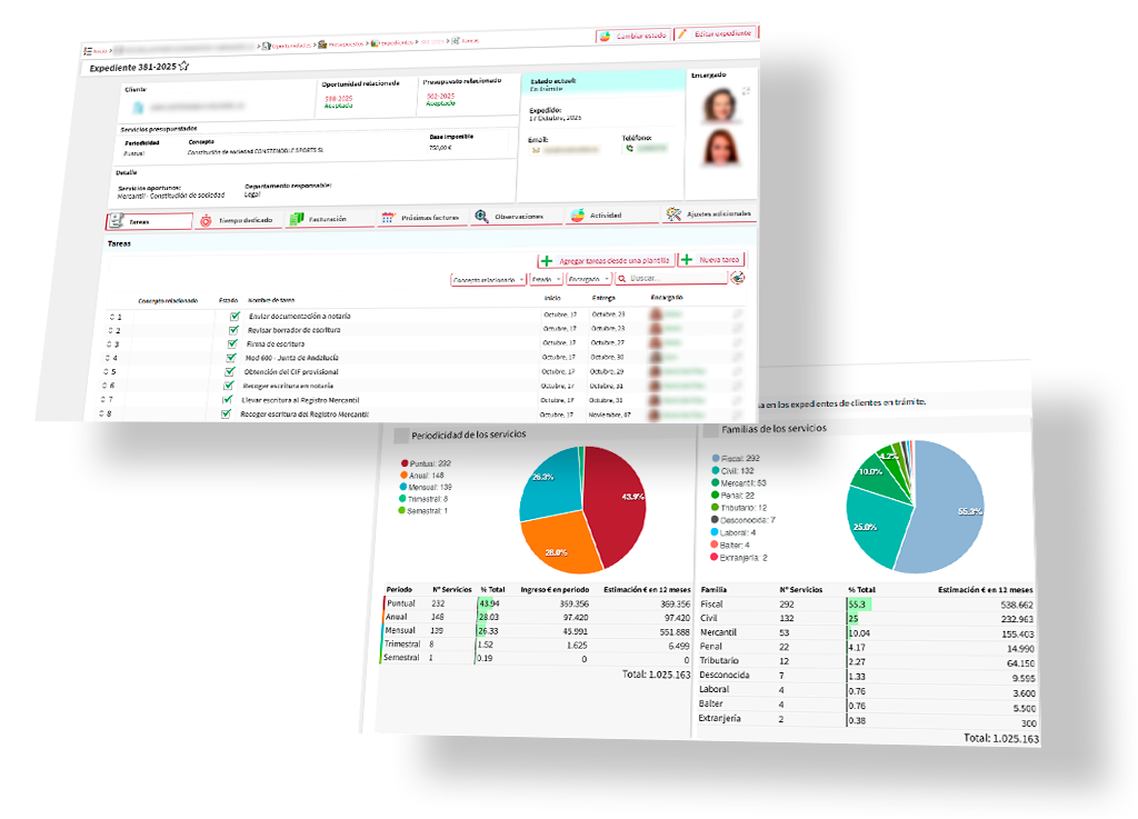 El Expediente se abre automáticamente conforme has aceptado el presupuesto. Las tareas de ese expediente también las tienes automatizadas. Los responsables podrán hacer seguimiento para que no falte detalle en cada expediente. Registra horas de trabajo y genera informes de horas según la dedicación real de tu equipo. Para rematar, cuando lo cierras te va a enviar un mensaje automático para facturar dicho expediente, evitando olvidos que suponen dinero y obtienes estadísticas de todo.