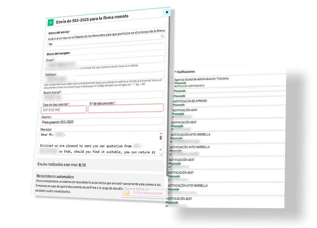 Firma Remota: Permite enviar propuestas para su firma telemática. Acelera la aceptación de presupuestos, evita desplazamientos e impresión de papel.