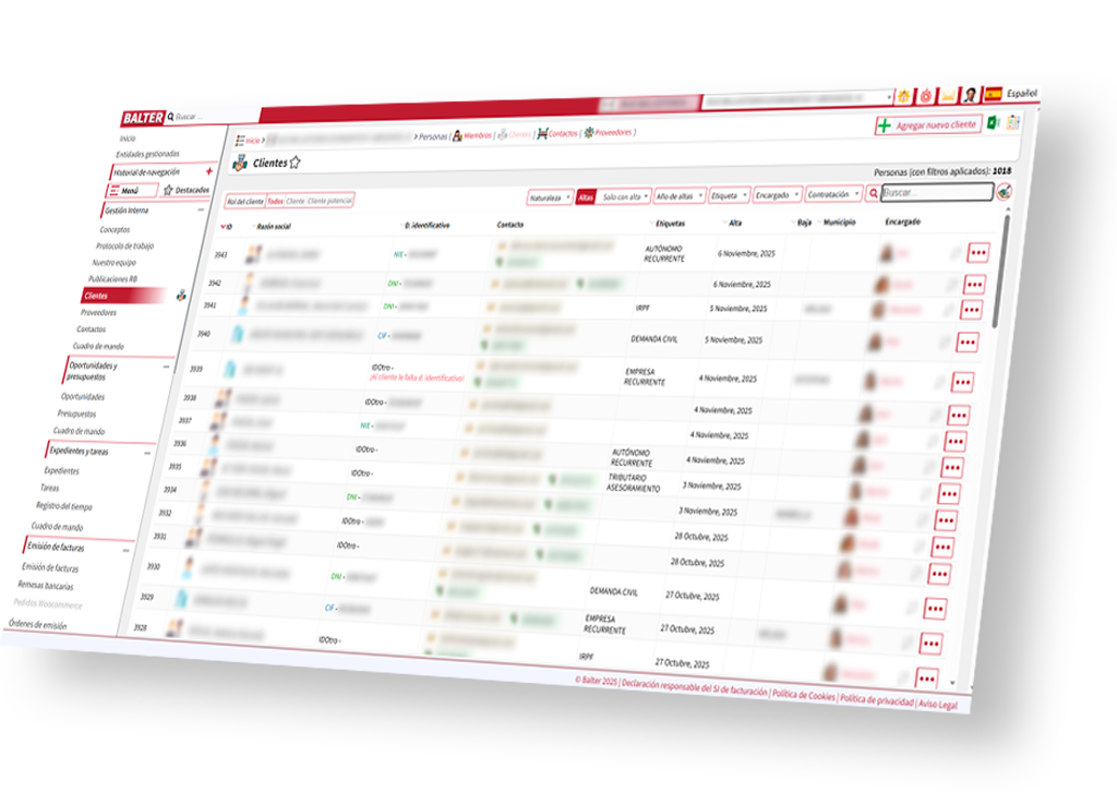 El núcleo operativo de BALTER. Permite crear y gestionar fichas de personas, empleados, clientes, contactos y proveedores. Configura usuarios, departamentos y permisos para cada perfil. Define los Conceptos y las Familias de tus servicios o productos para mantener el orden y la eficiencia desde el primer día.