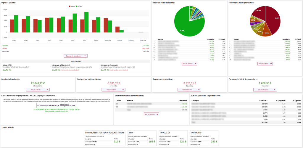 Este módulo está pensado para quienes necesitan conocer la rentabilidad real de su empresa, supervisar indicadores clave y anticiparse a desviaciones o riesgos. Desde la facturación por cliente hasta el EBITDA, tendrás una visión clara, actualizada y comparativa de todo lo que ocurre en tu negocio, sin depender del contable.