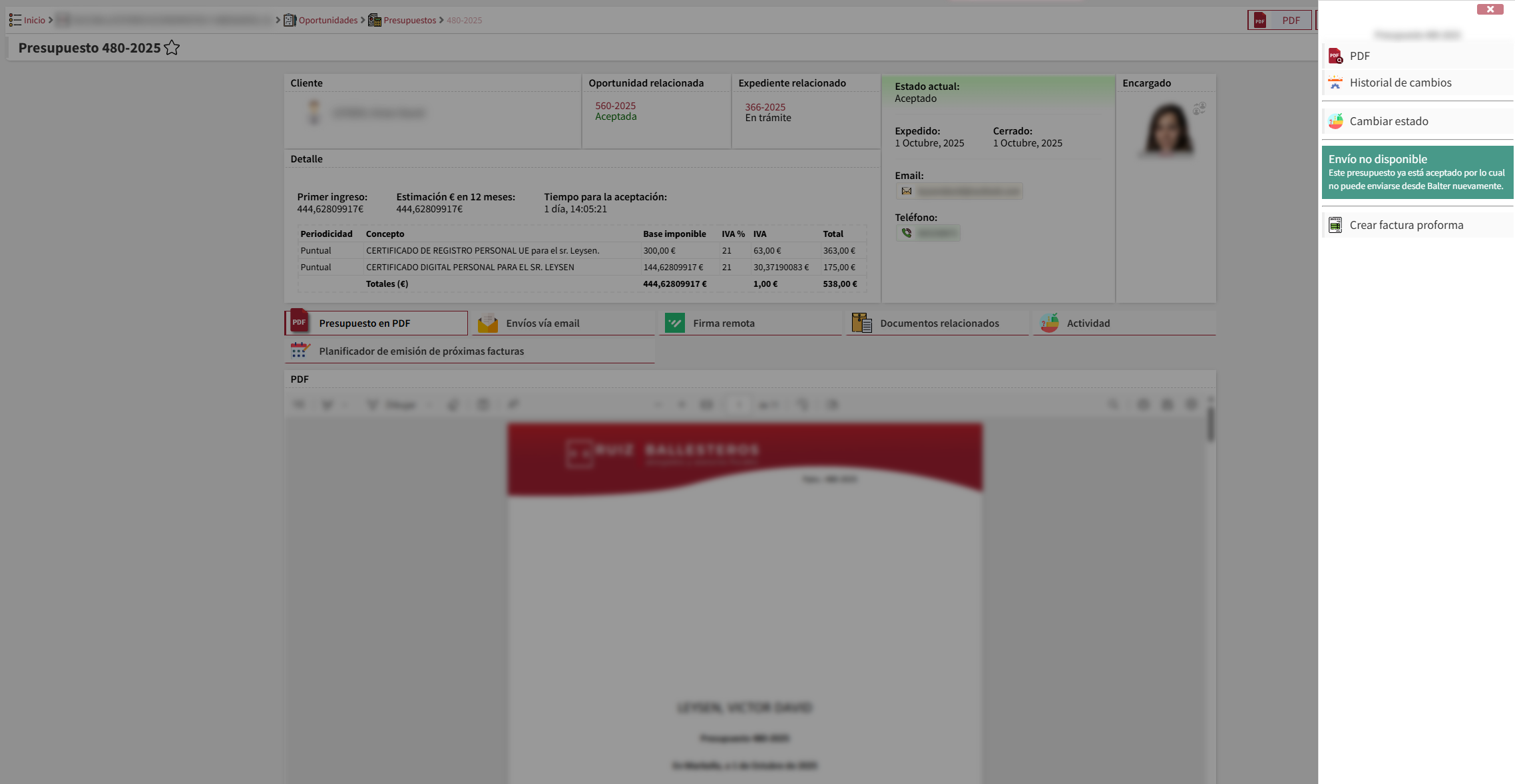 Las facturas en BALTER se generan a partir de los presupuestos aceptados, manteniendo toda la información del cliente, los conceptos y los importes vinculados.