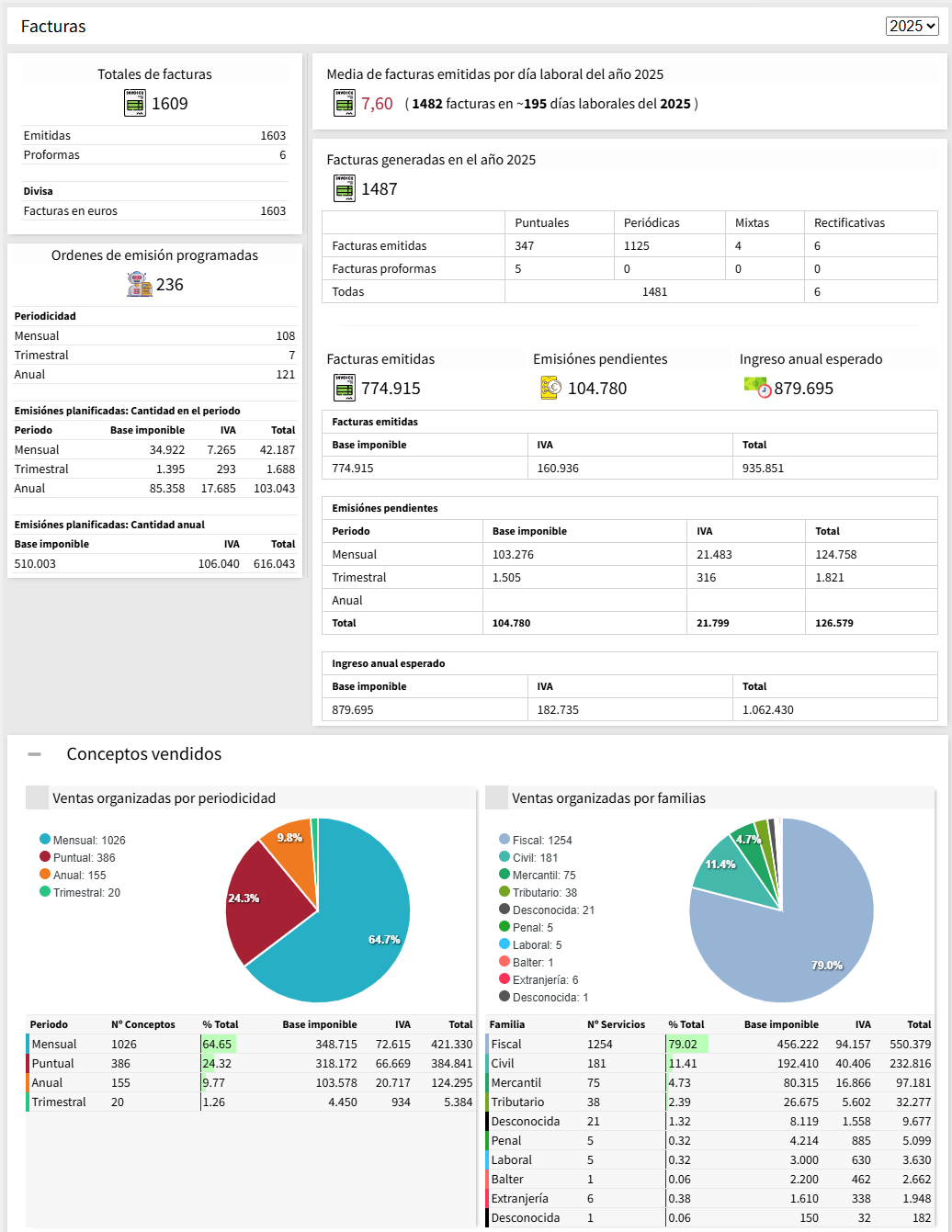 Consulta el número total de facturas emitidas, las órdenes programadas, los ingresos previstos y el importe pendiente de emisión.