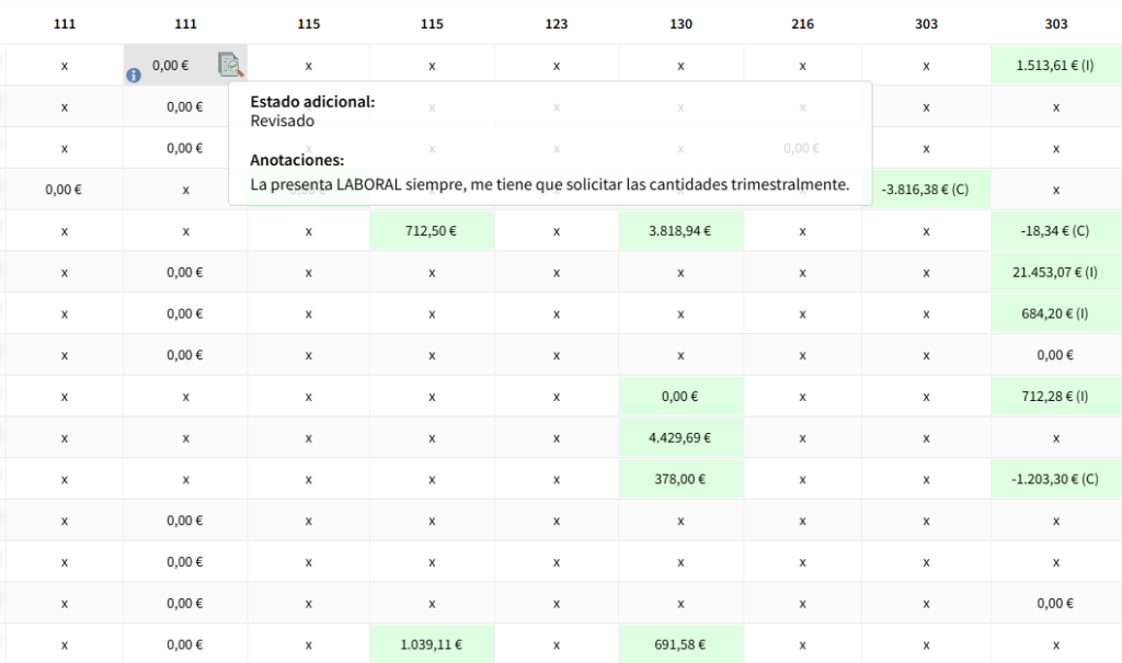 Consulta en una sola vista los principales modelos tributarios (111, 115, 130, 216, 303, entre otros). Cada registro muestra el importe, tipo de resultado (a ingresar, devolver, negativo o no presenta) y su estado: calculado, preparado, grabado, presentado o no obligado.